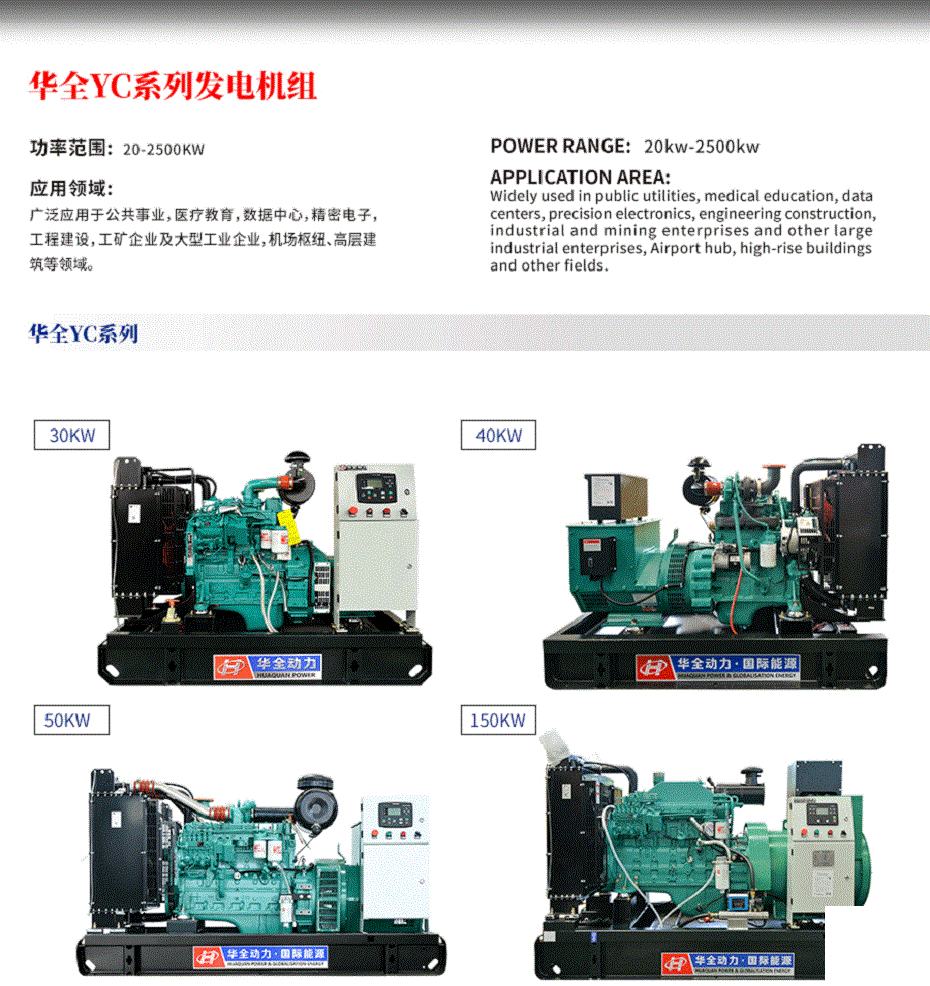 華全柴油發(fā)電機是山東華全動力股份有限公司(簡稱“華全動力”)生產(chǎn)的一系列發(fā)電設(shè)備,廣泛應(yīng)用于工業(yè)、商業(yè)、農(nóng)業(yè)、建筑、應(yīng)急電源等領(lǐng)域。